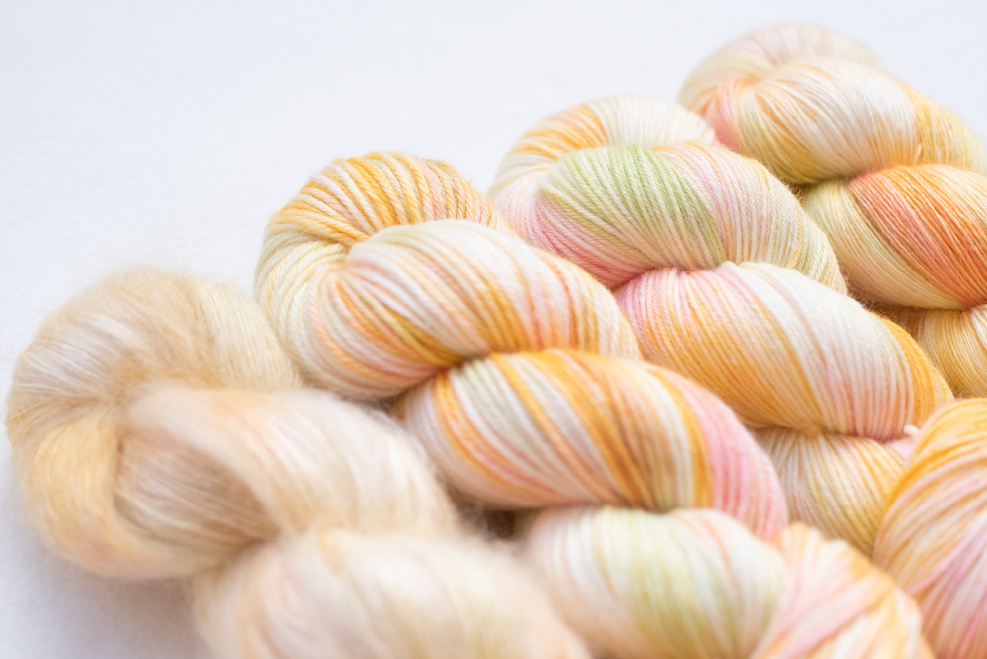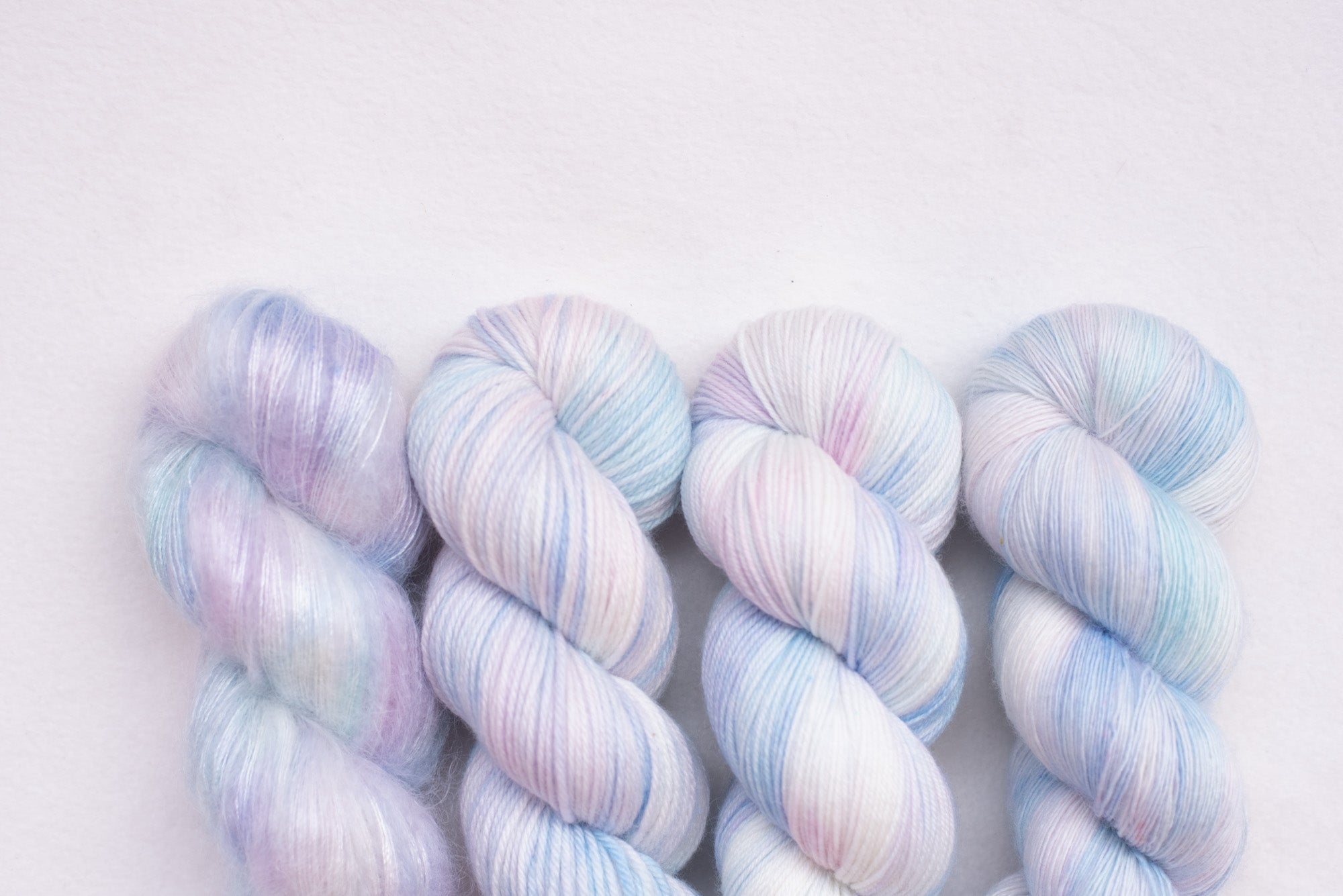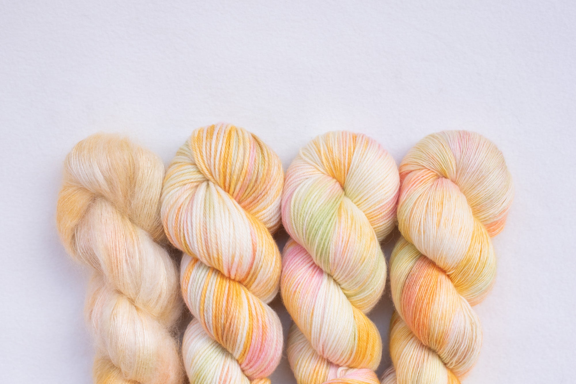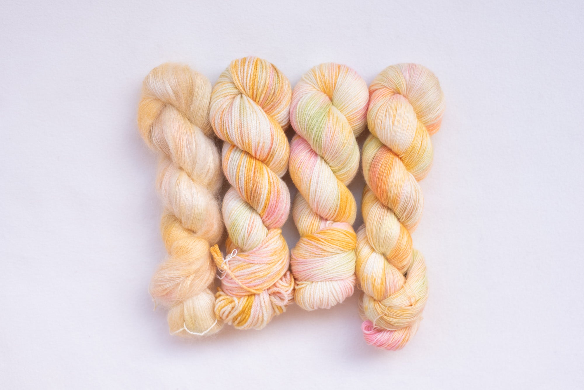 ギャラリーでは、左からこのベースで表示しています>Moko Mohair, Merino DK, Sock と Merino Singles Lace。最後の写真は色のインスピレーションとなったもの・場所です。