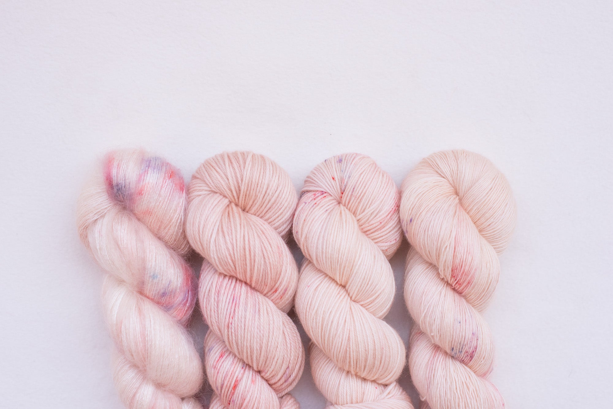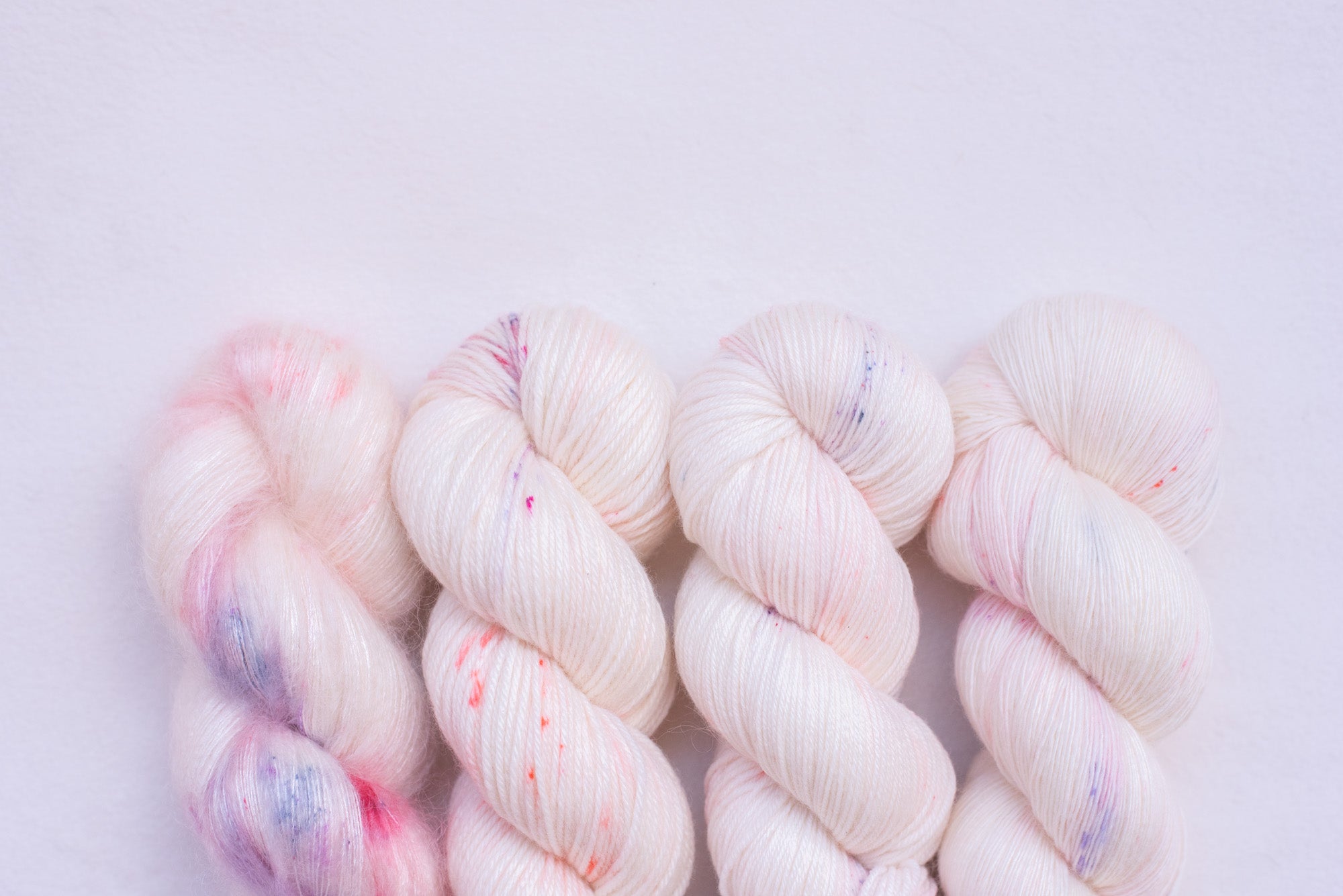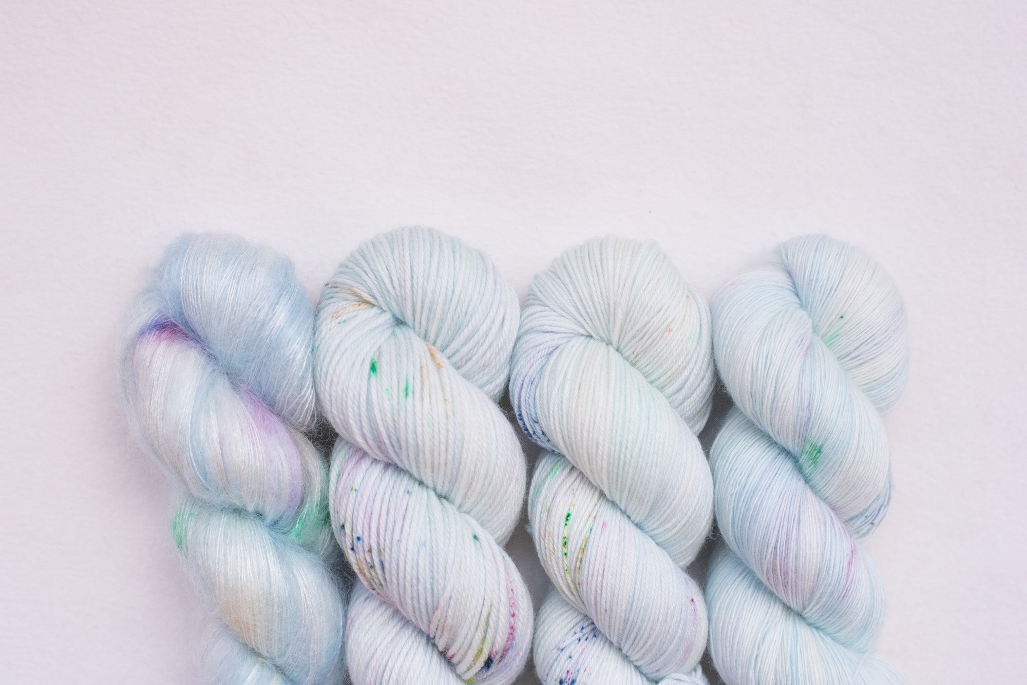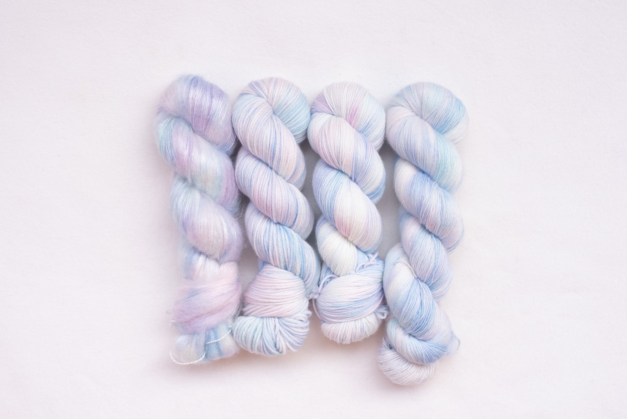 ギャラリーでは、左からこのベースで表示しています>Moko Mohair, Merino DK, Sock と Merino Singles Lace。最後の写真は色のインスピレーションとなったもの・場所です。