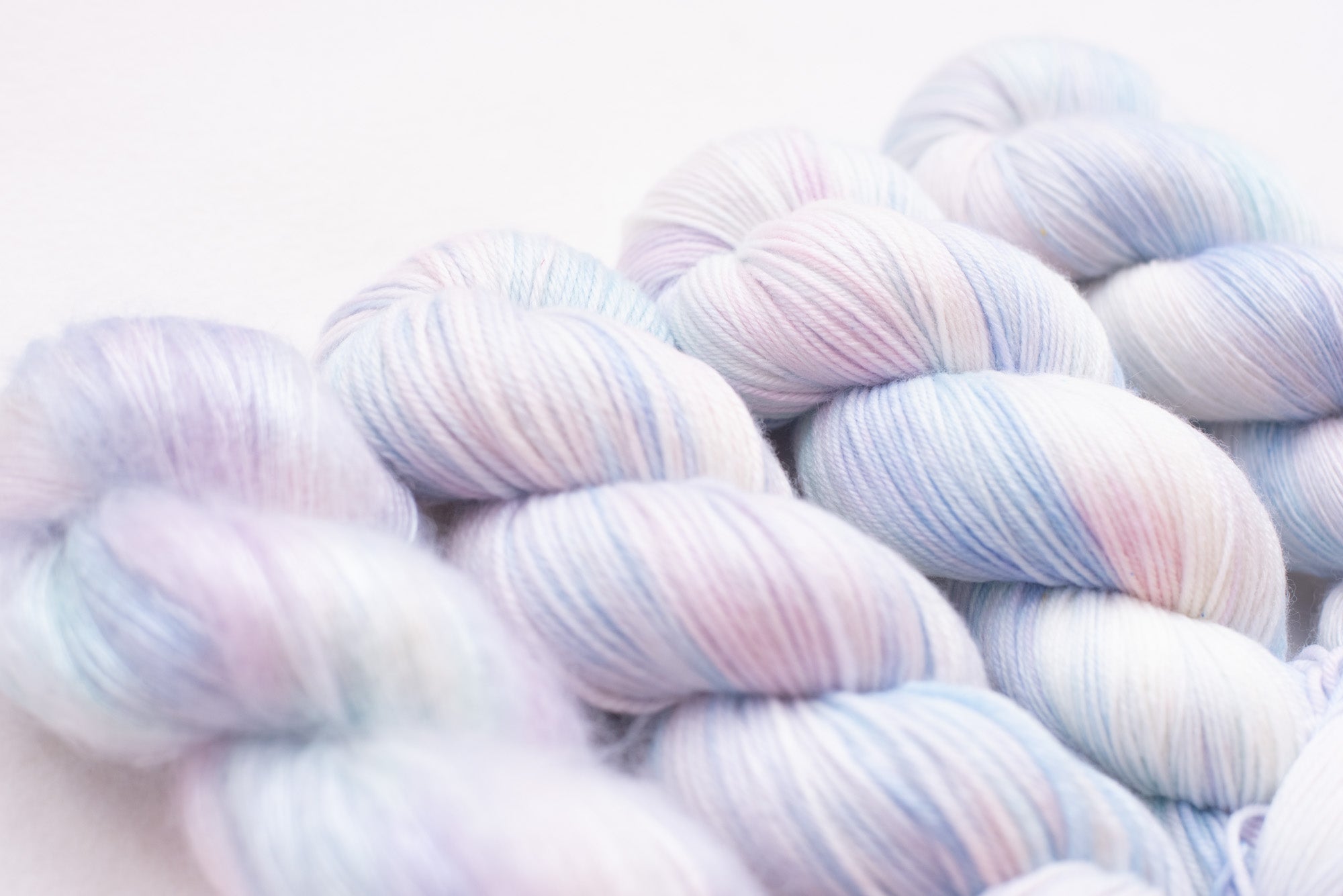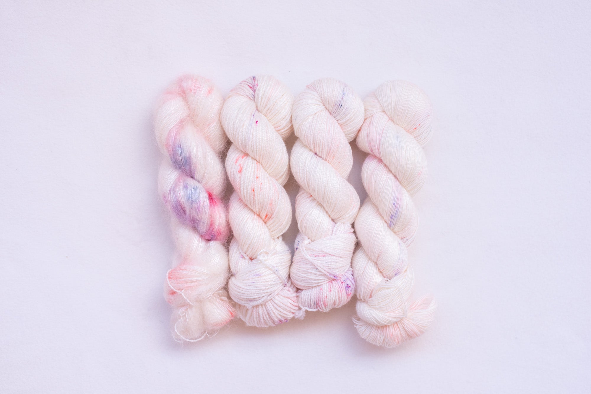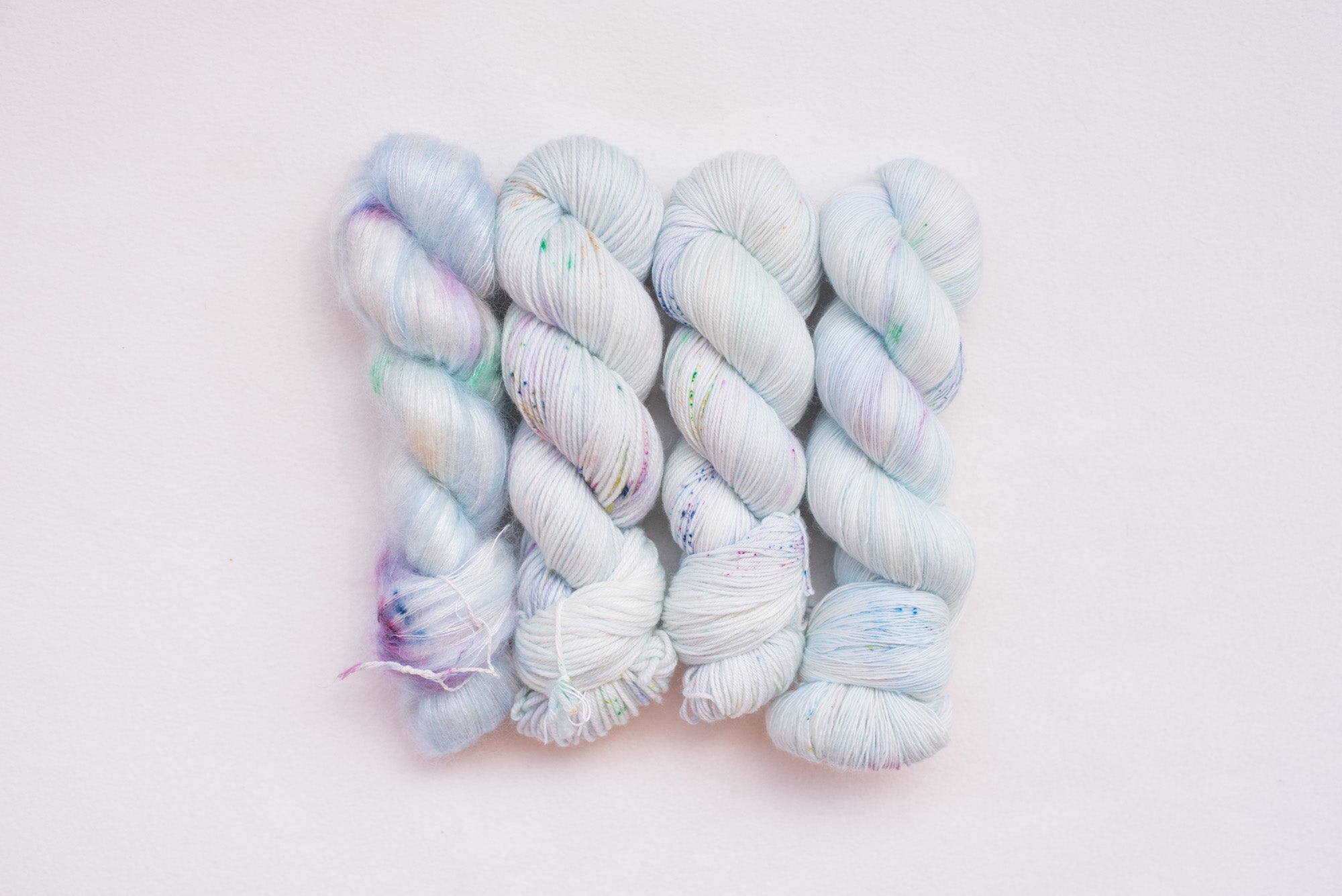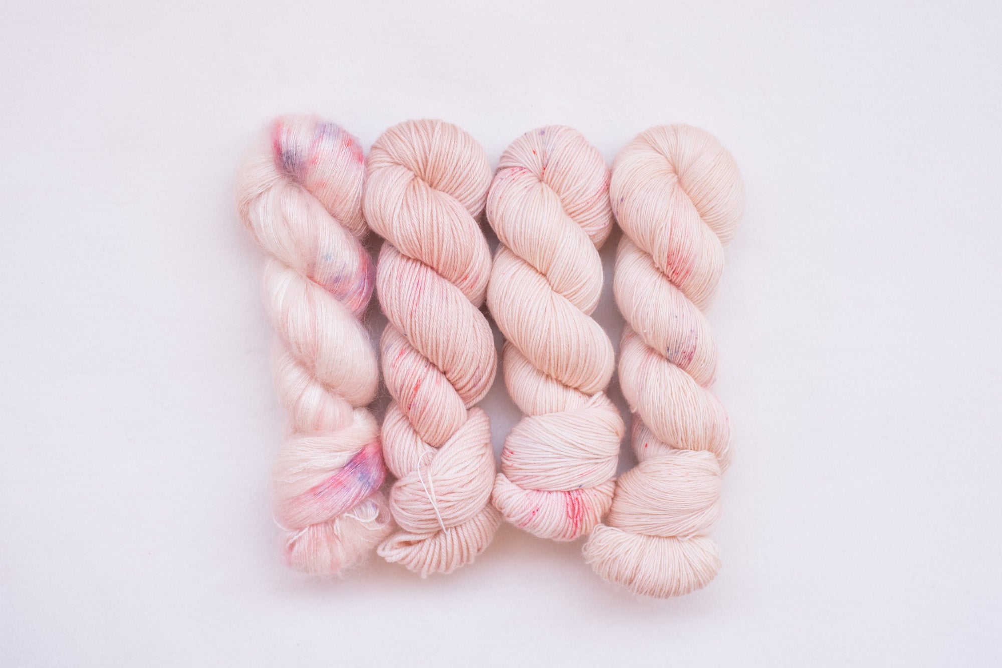 ギャラリーでは、左からこのベースで表示しています>Moko Mohair, Merino DK, Sock と Merino Singles Lace。最後の写真は色のインスピレーションとなったもの・場所です。
